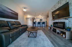 An open concept living area with patio door to your massive covered patio w/glass railing.